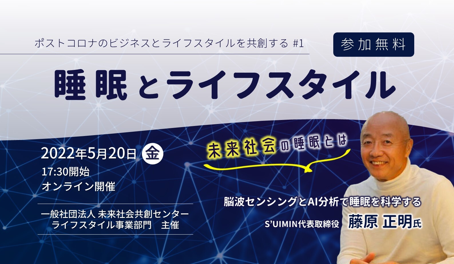 ●第1回のテーマは「睡眠とライフスタイル」として、脳波センシングとAI分析で睡眠を科学するS’UIMIN代表取締役の藤原正明さんをお迎えして、未来社会の睡眠について「しあわせライフスタイル研究班」の統括研究員である関谷剛(医師・産業医、東京大学未来ビジョン研究センターライフスタイル研究ユニット客員准教授)と語り合う予定。