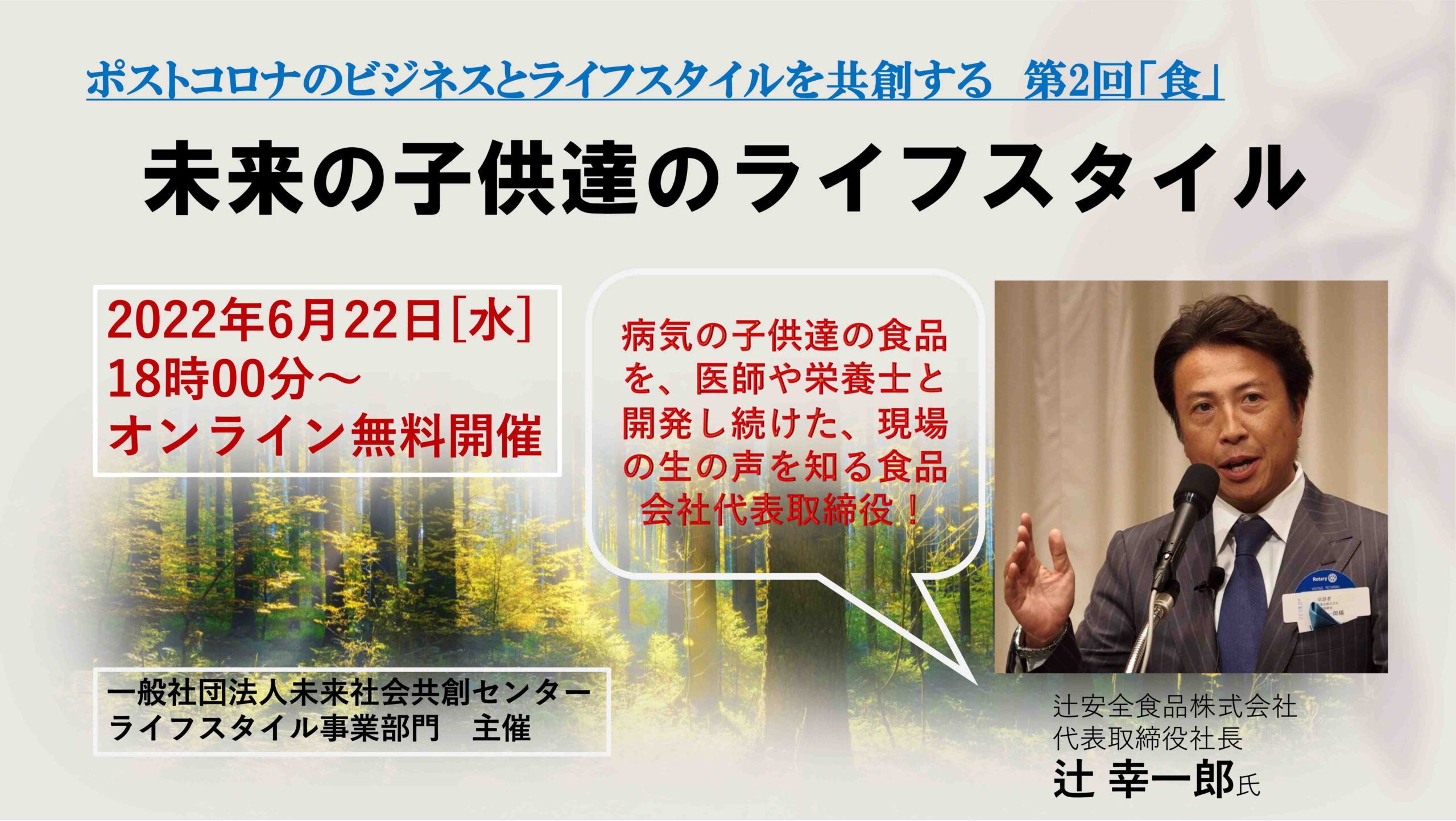 ●第2回は「食」をテーマにして、「未来の子供達のライフスタイル」として、食物アレルギー対応食品の製造と販売を行っている辻安全食品株式会社代表取締役社長の辻幸一郎さんをお迎えして、これまで携わってこられた子供達の食物アレルギーとライフスタイルの関係について語って頂き、未来の子供達のライフスタイルを考える上で「食」がどうあるべきかについて、「しあわせライフスタイル研究班」の統括研究員である関谷剛(医師・産業医、東京大学未来ビジョン研究センターライフスタイル研究ユニット客員准教授)と語り合う予定。